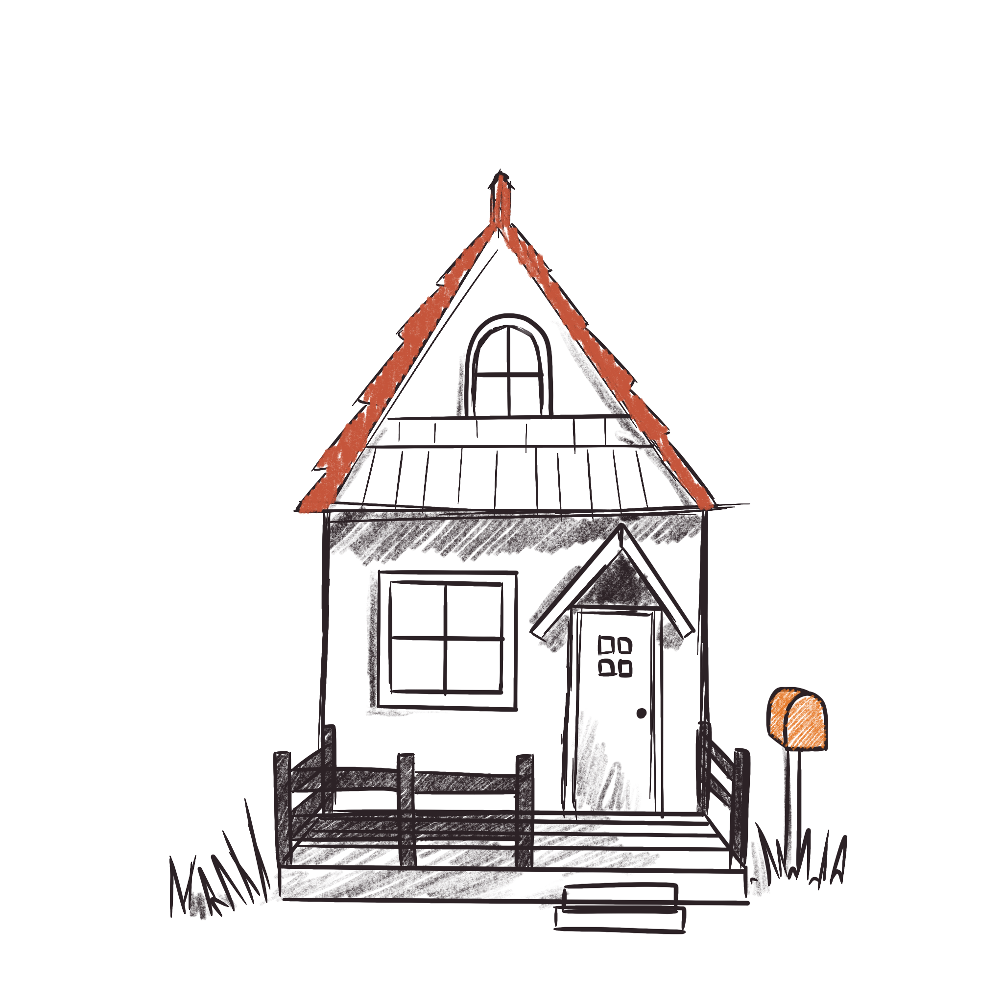 A two story house with a red tiled roof, a brown porch, black metal gates, and an orange mailbox…