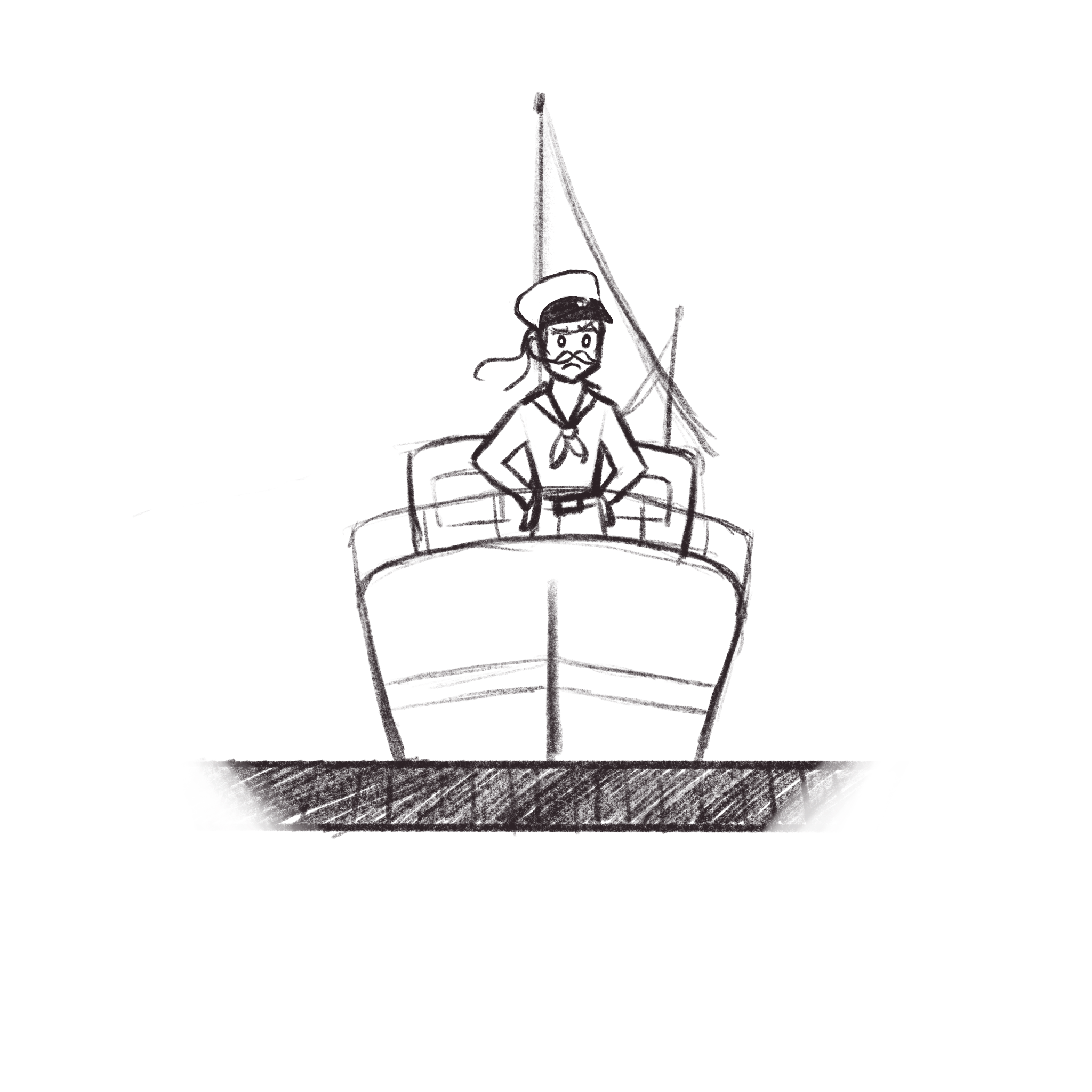 She looks up to see the head of a sailor peeking out of a boat’s cabin.