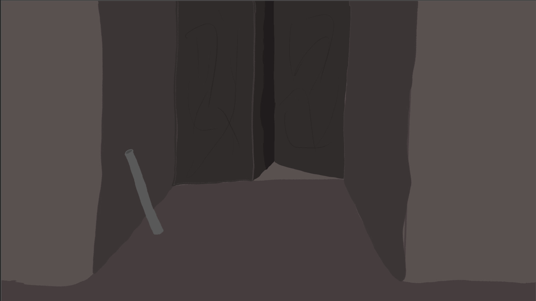 There is a cracked stone door next to the platform, probably from weathering. The door is slightly cracked open but not enough for a person to pass through.